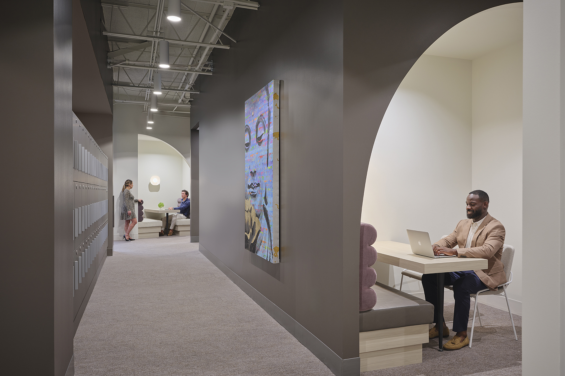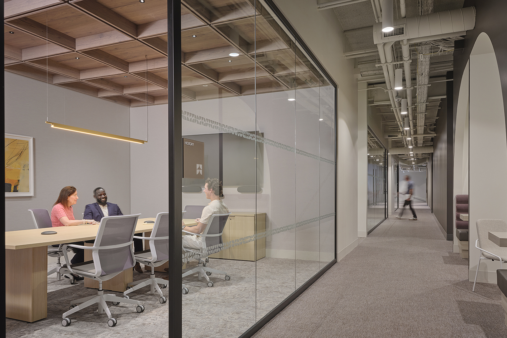 Lighting was crucial in creating an inviting atmosphere. We introduced pendant cylinder downlights in communal areas, recessed linear lights in private offices, and pendant clusters in collaborative zones—all visible from the outside.