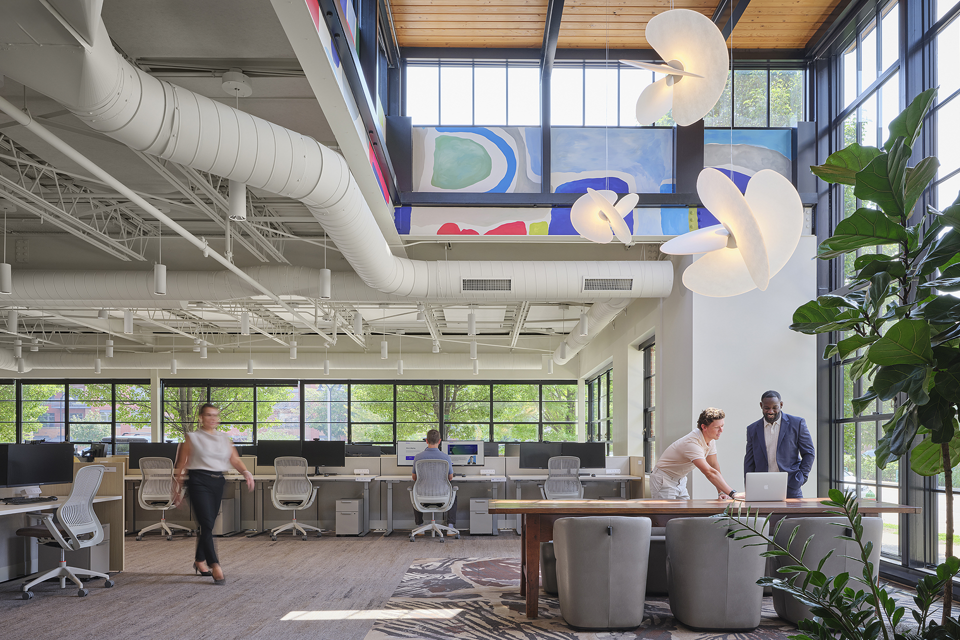 In collaboration with the Gensler team, Harwood developed solutions that reimagined the space. Enhancements to the existing emergency and standard power systems, ensuring that all wiring and controls are aligned with the new arrangement for furniture, A/V equipment, and lighting, were a top priority. On the mechanical front, we modernized the systems to align with the open-concept design, with exposed ductwork, and optimized HVAC zoning for improved comfort and efficiency.